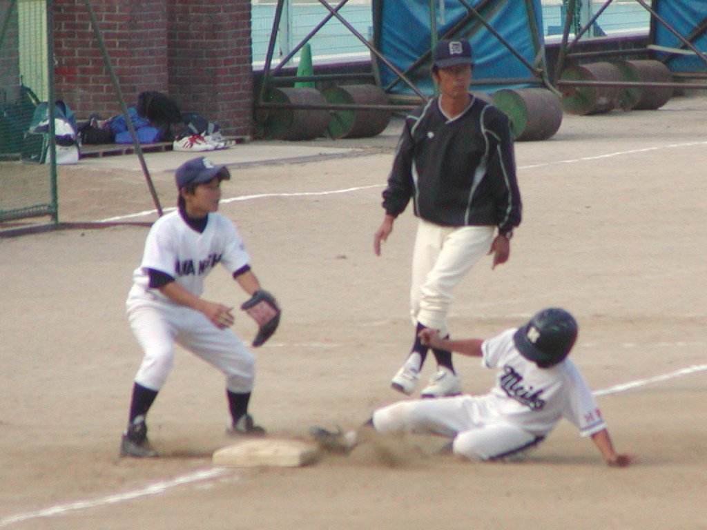 | 佐藤卓弥は一気に三塁へ到達、三塁打や!! |